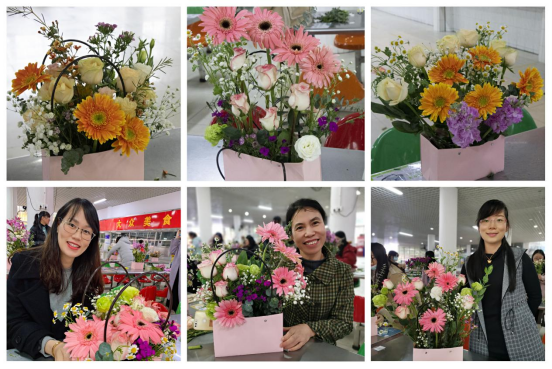下午3:30分,插花比赛正式开始。看着眼前多彩浪漫的玫瑰、优雅神秘的桔梗,零星点点的满天星,女职工们时而眉头微蹙,时而花颜婉悦,她们纤指轻捏、飞花逐叶,通过不同花材的巧妙搭配,构思出一件件或热烈或清雅的花艺作品。
