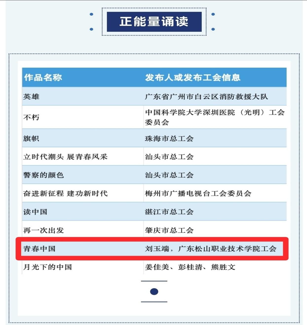 近日,由广东省总工会和广东省委网信办联合开展的2023年网聚职工正能量 争做南粤好网民主题活动评审结果重磅出炉。在300多个“正能量”优秀作品中,我校纪检室刘玉端老师的作品《青春中国》脱颖而出,获评网络正能量诵读“十佳作品”。